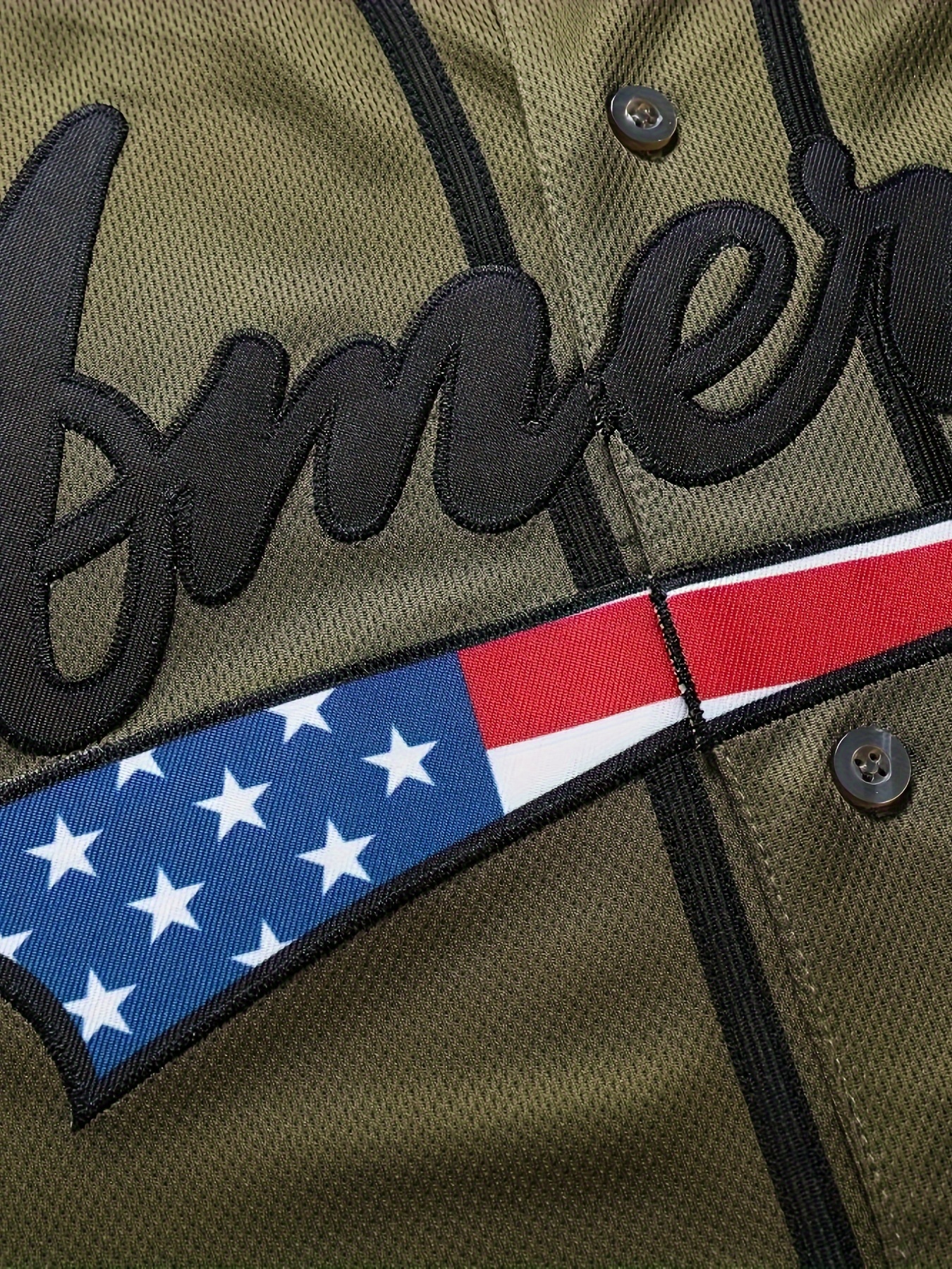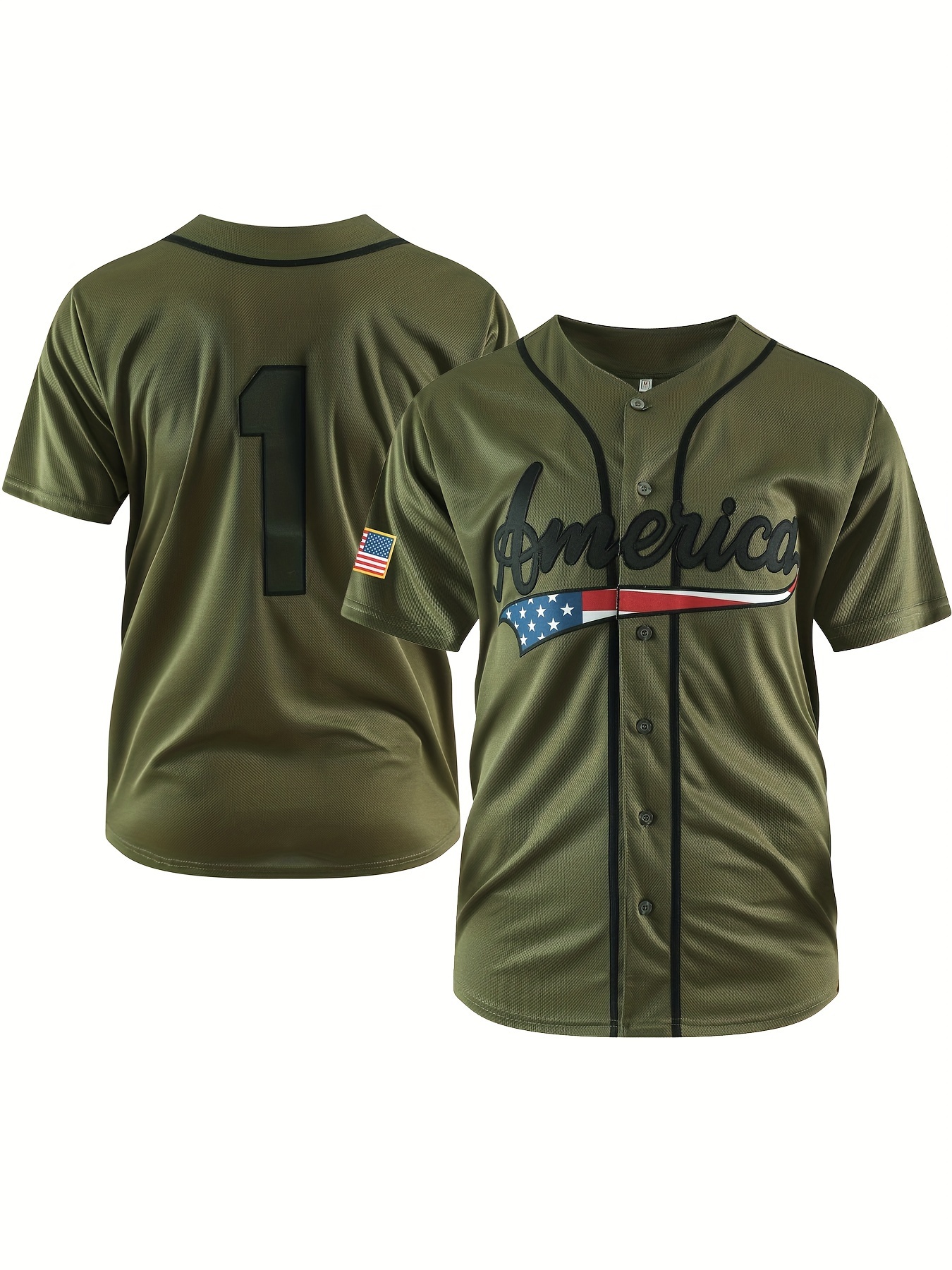 Men's #1 Army Green Baseball Jersey, Breathable Polyester, V-Neck with Button-Up Closure - Sporty & Casual Style for Everyday, Parties, Training & Streetwear