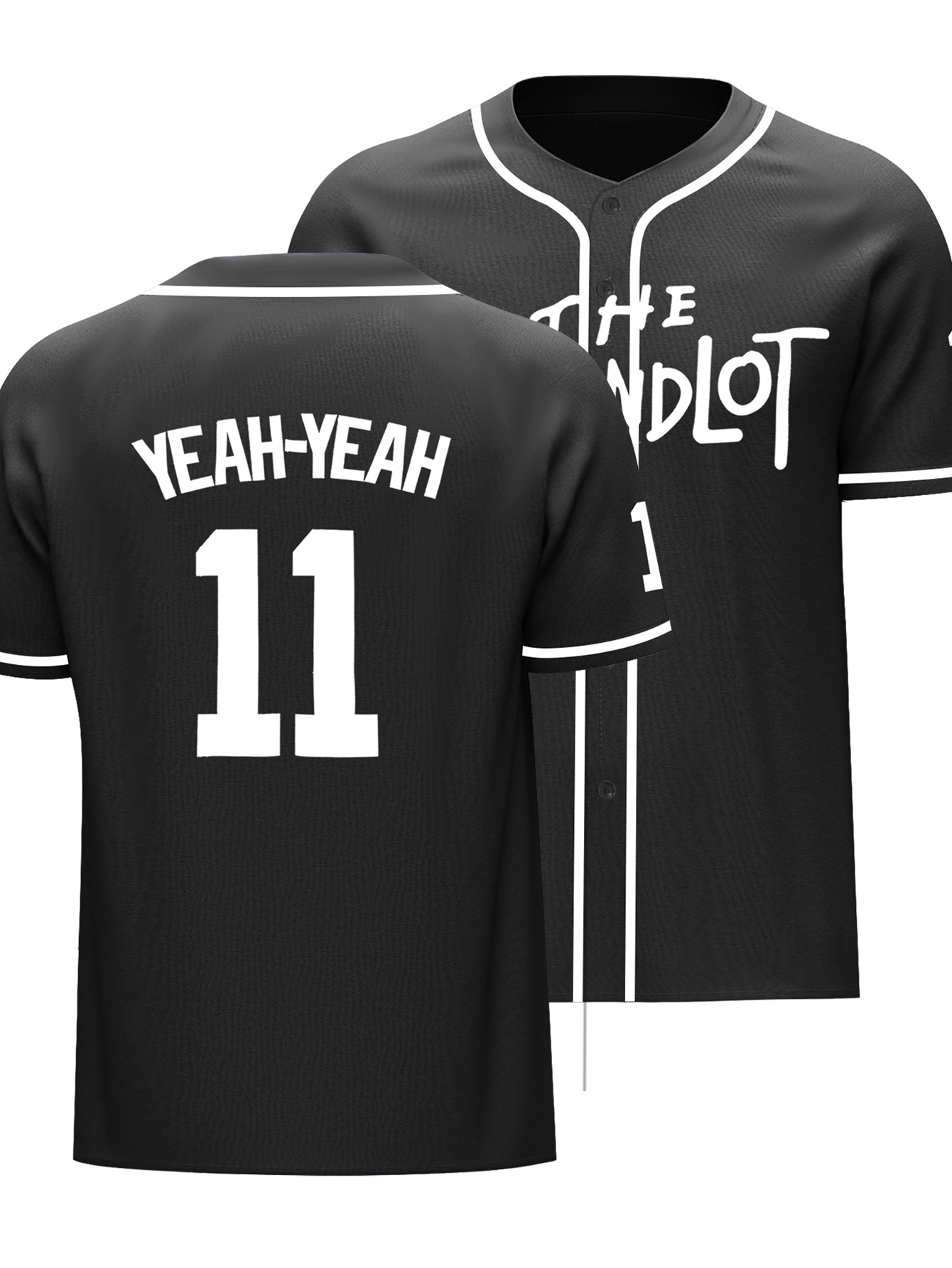 Men's Black #11 Baseball Shirt - Loose Fit V-Neck Embroidered "THE HANDLOT" & "YEAH-YEAH" Design, Breathable Button-Up Sportswear for Streetwear, Outdoor & Casual Wear, All-Season Comfort, Durable Embroidery