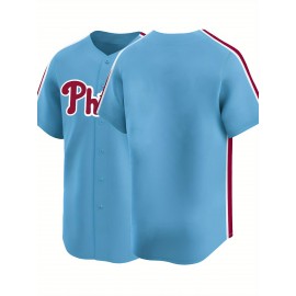Men'S Moon Blue Baseball Shorts, Classic Letter Embroidery Design, Breathable Button Style Short Sleeved Shirt, Suitable for Training And Competition