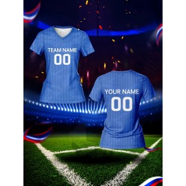 [Women's Soccer Jersey] Customized Women's V-Neck Soccer Jersey - Personalized Team Training Sports Shirt, Comfortable, Breathable, Quick-Dry for Fitness & Casual Wear, Blue with White & Yellow Graphics, Spring/Summer/Fall